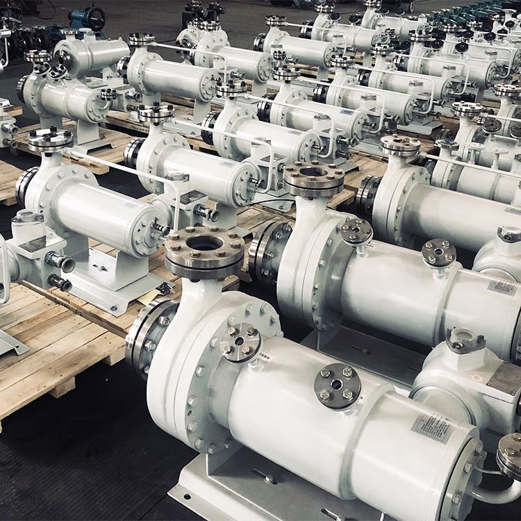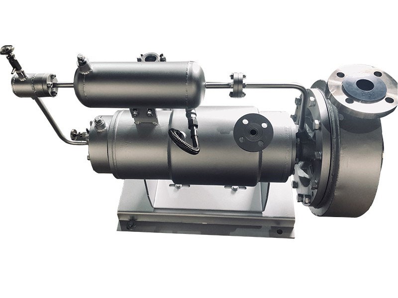 屏蔽泵是用同一根軸將電機(jī)的轉(zhuǎn)子和離心泵的葉輪固定在一起,然后用屏蔽套將這一組轉(zhuǎn)子屏蔽住。而電機(jī)的定子圍繞在屏蔽套的四周,屏蔽套是由金屬制成的,因此動(dòng)力可以通過磁力場(chǎng)傳遞給轉(zhuǎn)子。而整個(gè)轉(zhuǎn)子都在被泵送液體中運(yùn)轉(zhuǎn)。屏蔽的端部靠法蘭或焊接的結(jié)構(gòu)實(shí)現(xiàn)靜密封。屏蔽套實(shí)際上是一個(gè)壓力容器。定子的內(nèi)表面和轉(zhuǎn)子的外表面裝有耐腐蝕金屬薄板制造的定子屏蔽套和轉(zhuǎn)子屏蔽套。各自端面用耐腐蝕金屬薄板與它們焊接,與被輸送液體分隔,使定子繞組鐵芯和轉(zhuǎn)子鐵芯不受浸蝕。除了屏蔽套之外,還有一個(gè)部件是循環(huán)管,利用泵送液體對(duì)軸承潤(rùn)滑與冷卻,有時(shí)也對(duì)電機(jī)冷卻。屏蔽泵的軸向力平衡方式,通常采用自動(dòng)推力平衡裝置,有時(shí)也選用葉輪背面裝有徑向葉片,即背葉輪推力平衡機(jī)構(gòu)。